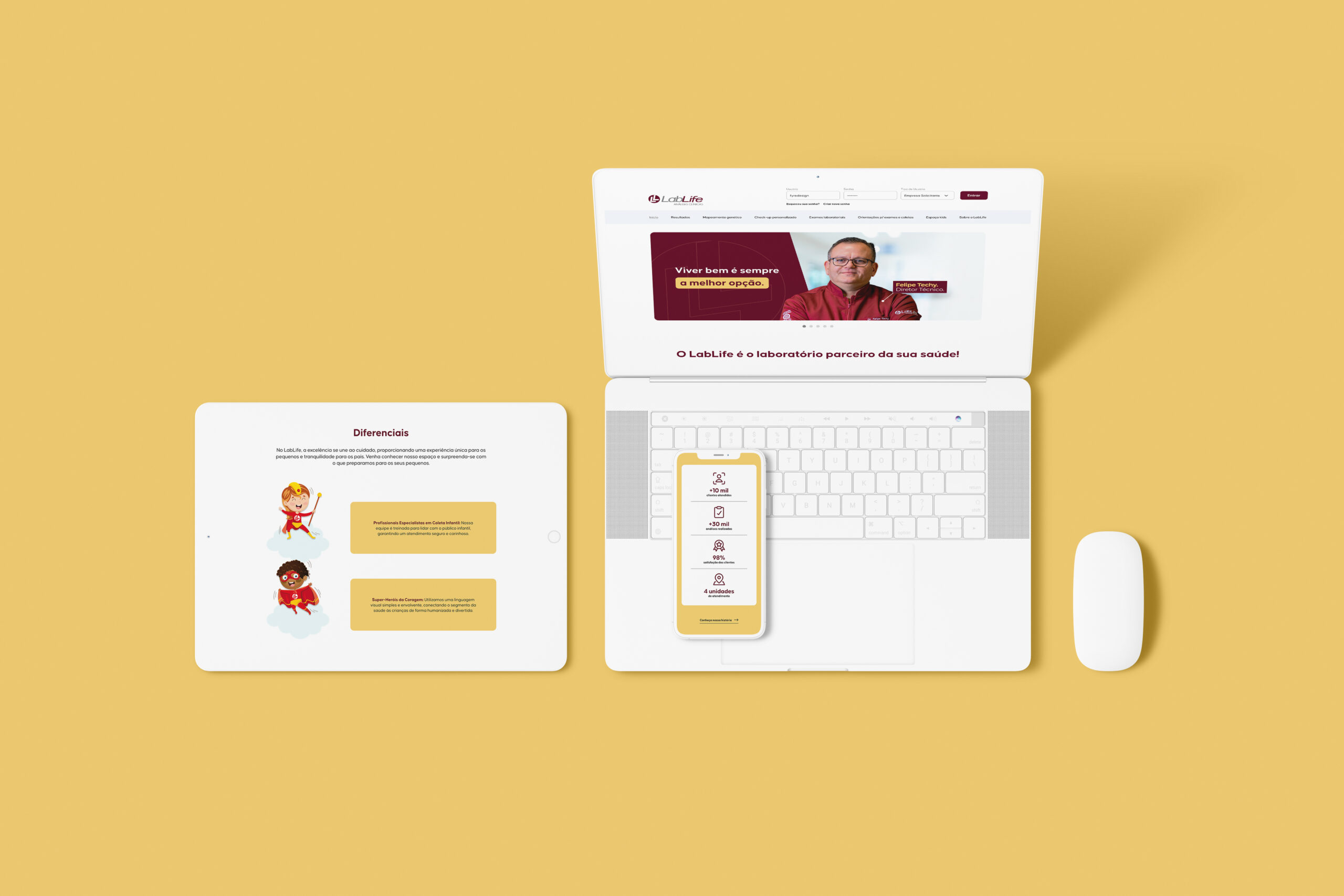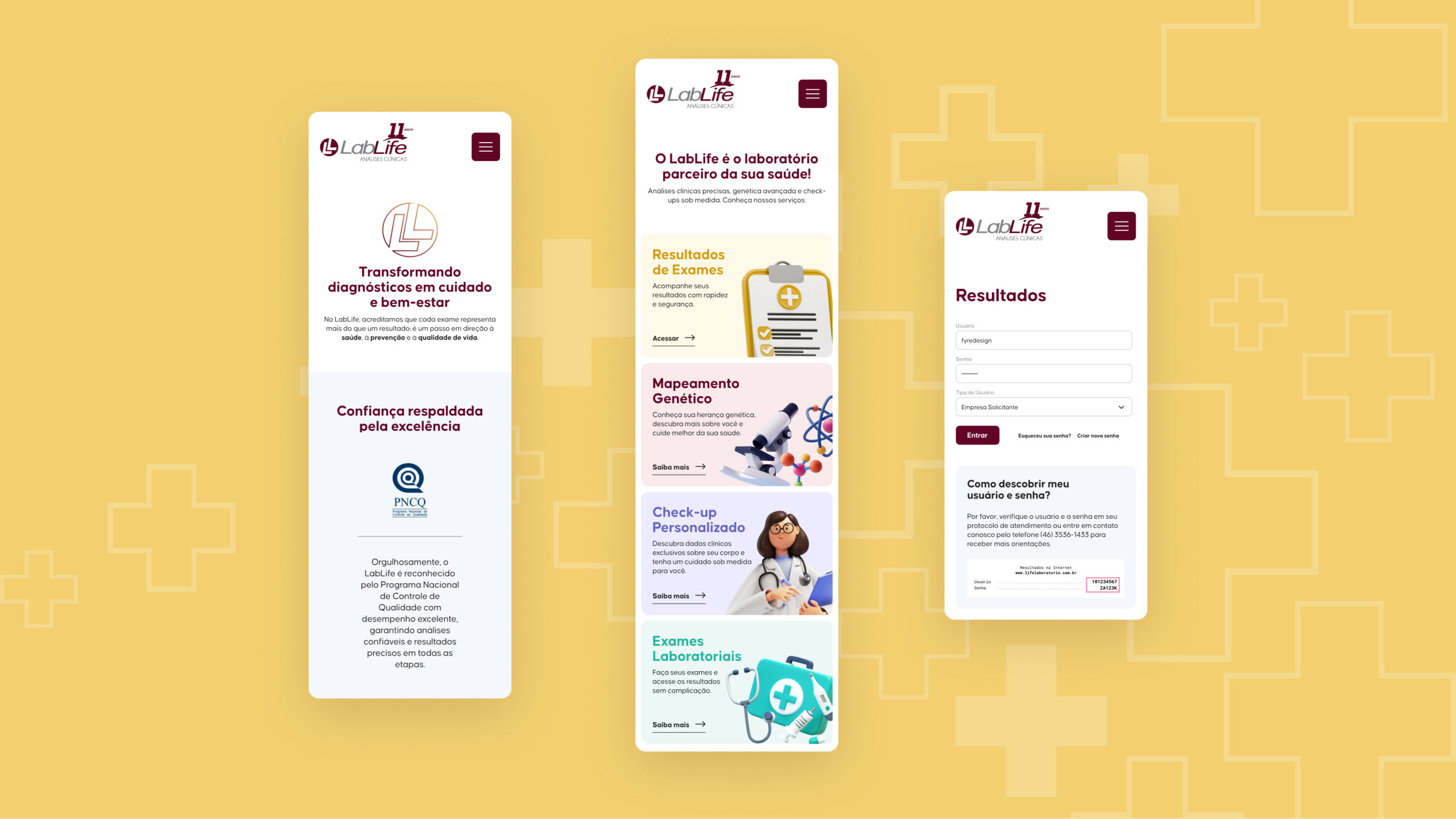 As cores suaves, o equilíbrio entre ícones e tipografia e o uso de ilustrações reforçam o compromisso do LabLife com um olhar positivo sobre a saúde. O resultado é um ambiente visual que inspira tranquilidade e reforça o papel do laboratório como parceiro de bem-estar.